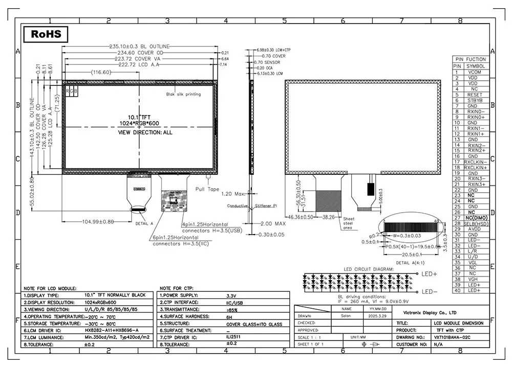 Ang Victronix ay isang propesyonal na tagagawa ng TFT module at tagapagtustos na nakabase sa China. Sa pamamagitan ng 18 taong karanasan sa larangang ito, nakabuo kami ng iba't ibang mga modelo. Bilang karagdagan sa aming mga karaniwang produkto, nag -aalok din kami ng mga pasadyang serbisyo upang matugunan ang mga tiyak na pangangailangan ng aming mga customer. Ang 10.1 pulgada 1024 × 600 LVDS TFT module na may CTP ay isang de-kalidad na 10.1 pulgada na module ng display ng TFT na ininhinyero para sa mga pang-industriya, medikal, at naka-embed na mga aplikasyon. Ang pagsasama -sama ng mataas na optical na pagganap, pag -andar ng capacitive touch, at pinalawak na pagiging maaasahan, naghahatid ito ng pambihirang kalinawan at tibay sa matinding mga kondisyon ng operating.