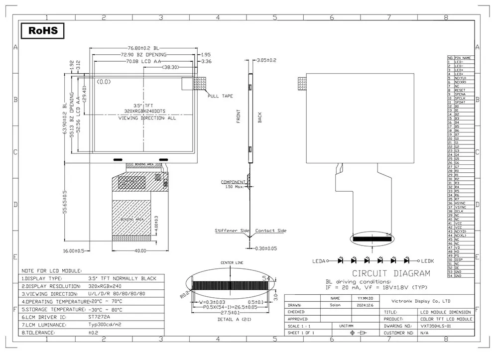 Ang TFT LCD ay isang uri ng likidong pagpapakita ng kristal na gumagamit ng manipis na film transistor na teknolohiya upang mapahusay ang kalidad ng imahe, at mayroon itong maraming mga aplikasyon sa pang-araw-araw na buhay. Bilang isang propesyonal na tagagawa ng module ng TFT at tagapagtustos sa Tsina, ano ang gumagawa ng Victronix 3.5 pulgada 320 × 240 QVGA IPS TFT module na naiiba sa iba pang mga tagagawa? Una, nag -aalok ito ng isang tipikal na ningning ng 300 cd/m², malawak na 80 ° na pagtingin sa mga anggulo sa lahat ng mga direksyon, at isang ratio ng kaibahan na 800: 1, tinitiyak ang mahusay na kakayahang mabasa mula sa iba't ibang mga anggulo. Pangalawa, isinasama nito ang isang yunit ng backlight na gumagamit ng 6s puting LEDs na may isang tipikal na buhay na 30,000 hanggang 50,000 na oras (sa 50% paunang ningning), na tinitiyak ang malinaw na kakayahang makita sa lahat ng mga kondisyon ng pag -iilaw. Bukod sa, sinusuportahan nito ang isang RGB 24-bit interface sa ST7272A controller. Bilang karagdagan, ipinapasa nito ang mahigpit na pagsubok sa kapaligiran, kabilang ang thermal shock (-30 ° C ↔ +80 ° C cycle), pag-iimbak ng kahalumigmigan (60 ° C/90% RH), at mekanikal na panginginig ng boses, tinitiyak na maaari itong gumana nang walang putol sa isang pinahabang saklaw ng temperatura (-20 ° C hanggang +70 ° C).