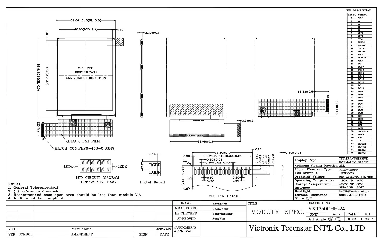 Ang VXT350CHH-24 ay isang mataas na kalidad na 3.5 pulgada 320x480 na mababasa ng Sunlight na TFT module na display na partikular na idinisenyo para sa mga aplikasyon ng pang-industriya. Ang TFT LCD display na ito, na nilagyan ng HX8357D ay naghahatid ng pambihirang pagganap at pagiging maaasahan sa mapaghamong mga kapaligiran.