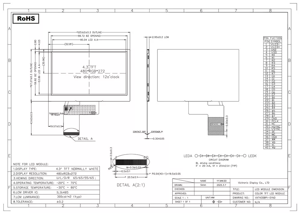 Ang TFT LCD ay isang uri ng likidong pagpapakita ng kristal na gumagamit ng manipis na film transistor na teknolohiya upang mapahusay ang kalidad ng imahe, at mayroon itong maraming mga aplikasyon sa pang-araw-araw na buhay. Bilang isang propesyonal na tagagawa ng module ng TFT at tagapagtustos sa Tsina, ano ang gumagawa ng Victronix 4.3 pulgada 480 × 272 pang -industriya na TFT module na naiiba sa iba pang mga tagagawa? Una, nag -aalok ito ng isang tipikal na ningning ng 300CD/m², isang malawak na anggulo ng pagtingin na 65 ° sa 12 na direksyon, at isang kaibahan na ratio ng 700: 1, tinitiyak ang mahusay na kakayahang mabasa mula sa iba't ibang mga anggulo. Pangalawa, isinasama nito ang isang yunit ng backlight na gumagamit ng 7S1P-White LEDs na may isang tipikal na buhay na 30,000 hanggang 50,000 na oras (hanggang 50% paunang ningning), na tinitiyak ang malinaw na kakayahang makita sa lahat ng mga kondisyon ng pag-iilaw. Bukod, sinusuportahan nito ang isang interface ng RGB kasama ang ILI6485 controller. Bilang karagdagan, ipinapasa nito ang mahigpit na pagsubok sa kapaligiran, kabilang ang thermal shock (-30 ° C ↔ +80 ° C cycle), pag-iimbak ng kahalumigmigan (60 ° C/90% RH), at mekanikal na panginginig ng boses, tinitiyak na maaari itong gumana nang walang putol sa isang pinahabang saklaw ng temperatura (-20 ° C hanggang +70 ° C).
