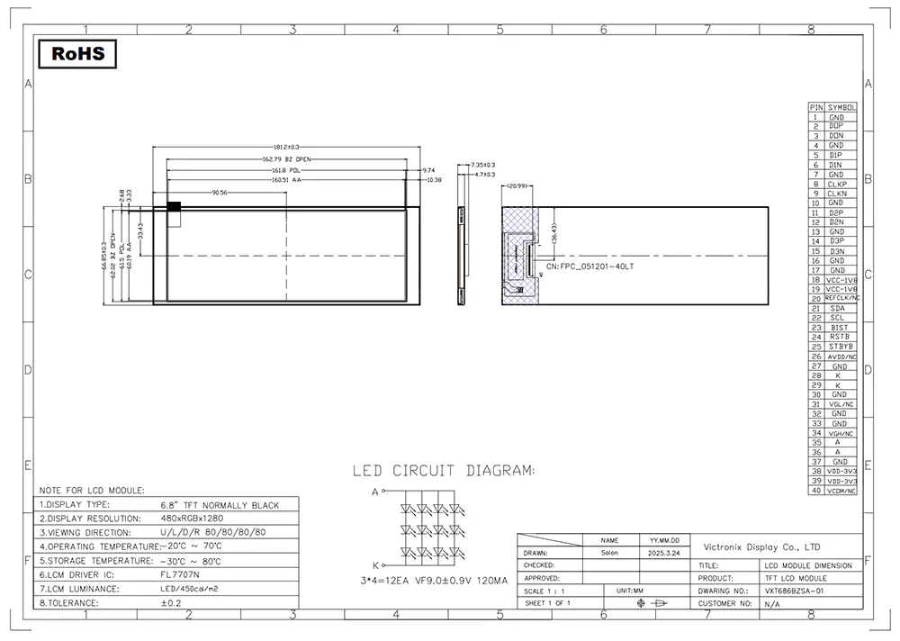 Ang TFT LCD ay isang uri ng likidong pagpapakita ng kristal na gumagamit ng manipis na film transistor na teknolohiya upang mapahusay ang kalidad ng imahe, at mayroon itong maraming mga aplikasyon sa pang-araw-araw na buhay. Bilang isang propesyonal na tagagawa ng module ng TFT at tagapagtustos sa China, ano ang gumagawa ng Victronix 6.86 pulgada 480 × 1280 IPS TFT module na naiiba sa iba pang mga tagagawa? Sa una, nag -aalok ito ng isang tipikal na ningning ng 450CD/m², 16.7m na kulay, isang malawak na anggulo ng pagtingin na 80 ° (tipikal) sa lahat ng mga direksyon, at isang ratio ng kaibahan na 800: 1, tinitiyak ang mahusay na kakayahang mabasa mula sa iba't ibang mga anggulo. Pangalawa, isinasama nito ang isang yunit ng backlight na gumagamit ng 3 × 4 na puting LEDs na may isang tipikal na buhay na 30,000 hanggang 50,000 na oras (hanggang 50% paunang ningning), tinitiyak ang malinaw na kakayahang makita sa lahat ng mga kondisyon ng pag -iilaw. Bukod, gumagamit ito ng isang 4-lane MIPI DSI interface para sa high-speed data transfer at pinasimple na pagsasama. Bilang karagdagan, ipinapasa nito ang mahigpit na pagsubok sa kapaligiran, kabilang ang mataas/mababang pag -iimbak ng temperatura at operasyon, pagbibisikleta ng temperatura, pagsubok ng DAMP heat (kahalumigmigan) upang maaari itong gumana nang walang putol sa isang pinahabang saklaw ng temperatura mula -20 ° C hanggang +70 ° C.